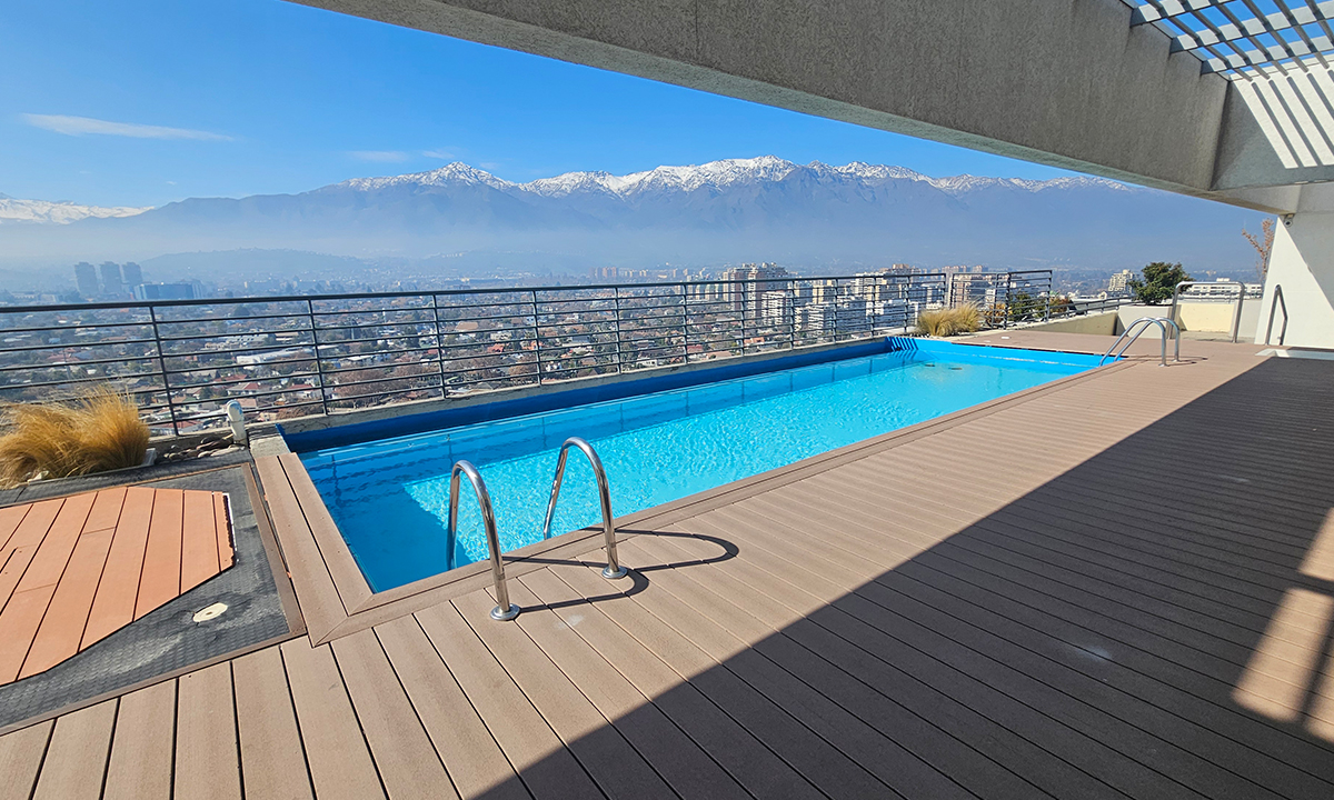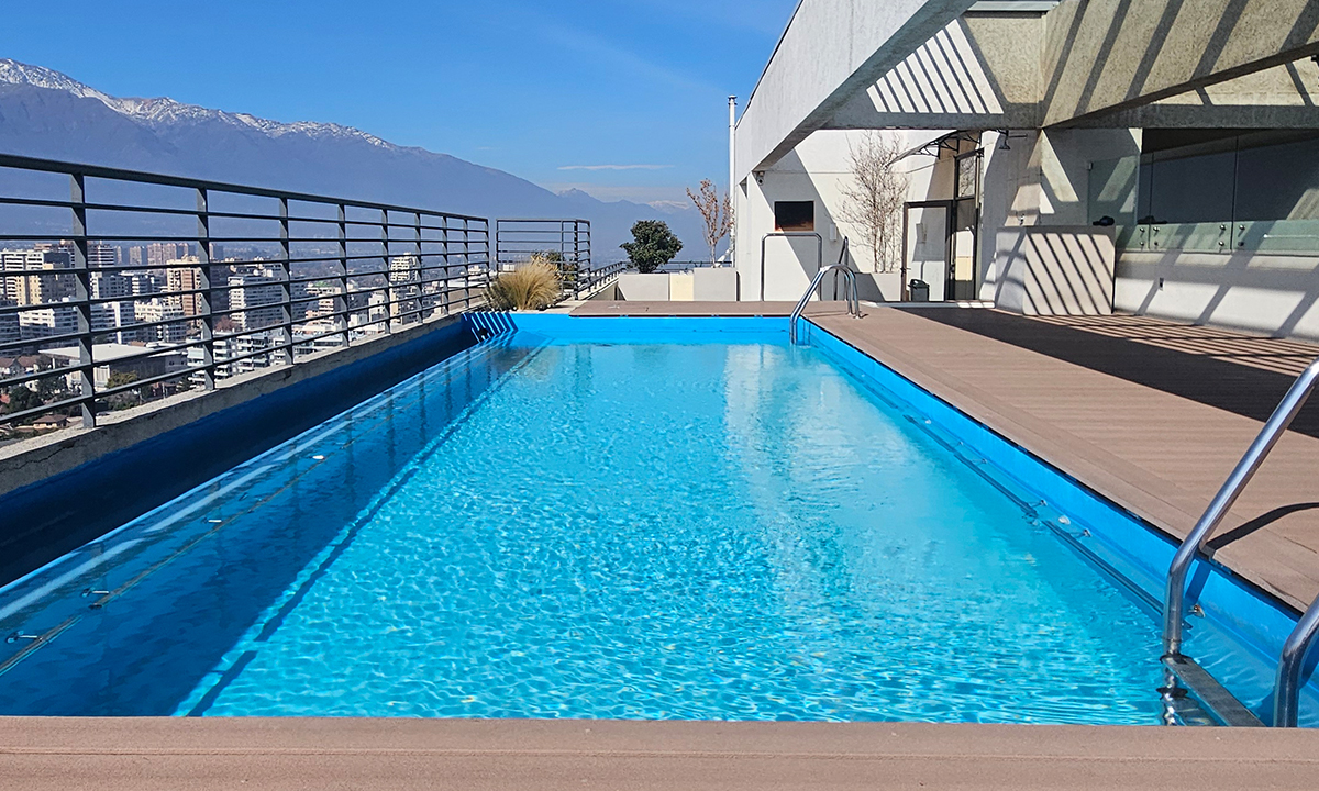 Relájate en nuestra piscina Un espacio diseñado para desconectarte de la rutina y disfrutar del equilibrio perfecto entre descanso y sofisticación. Sumérgete en un ambiente tranquilo, con vistas que invitan a vivir Santiago desde otra perspectiva, ya sea para comenzar tu día con energía o terminarlo con calma.